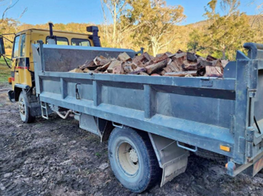 Two heavy vehicles were loaded, one with a large quantity of chopped wood, and another with sand. Both vehicles had their loads piled higher than the sides of the tipper body. In both cases, the loads were not covered, leaving them in danger of shifting or spilling during transport.